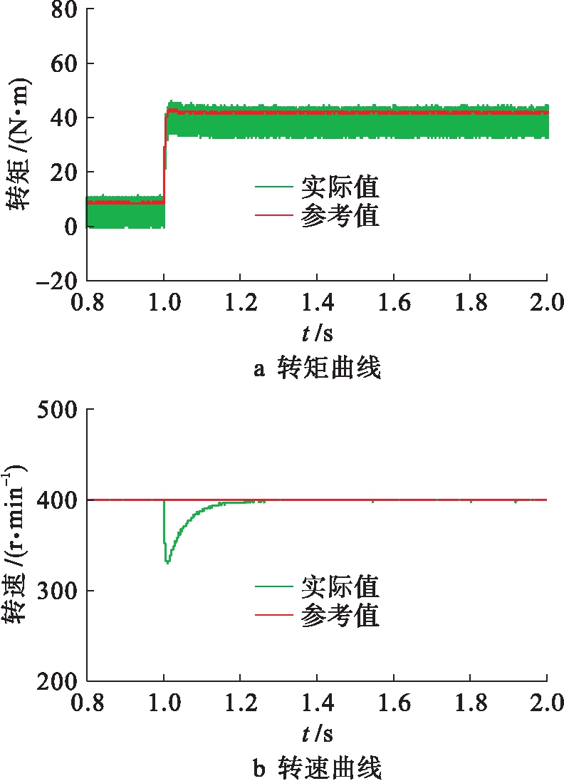 图8给出了占空比DTC突加负载时的结果,电机给定转速保持在400 r/min,在1 s时负载转矩由0 N·m变为40 N·m.从仿真结果可以看出,转矩能很快地跟踪参考值,转速恢复时间约为0.2 s.