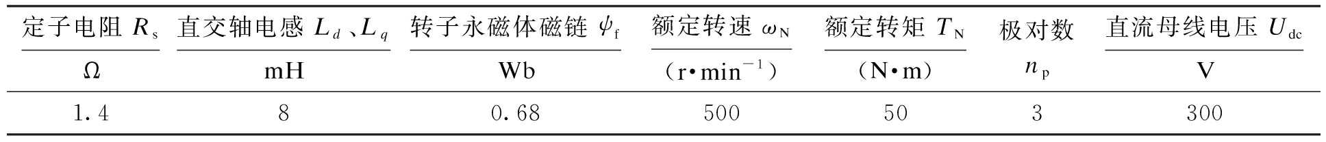 定子电阻RsΩ直交轴电感Ld、LqmH转子永磁体磁链ψfWb额定转速ωN(r·min-1)额定转矩TN(N·m)极对数np直流母线电压UdcV1.480.68500503300