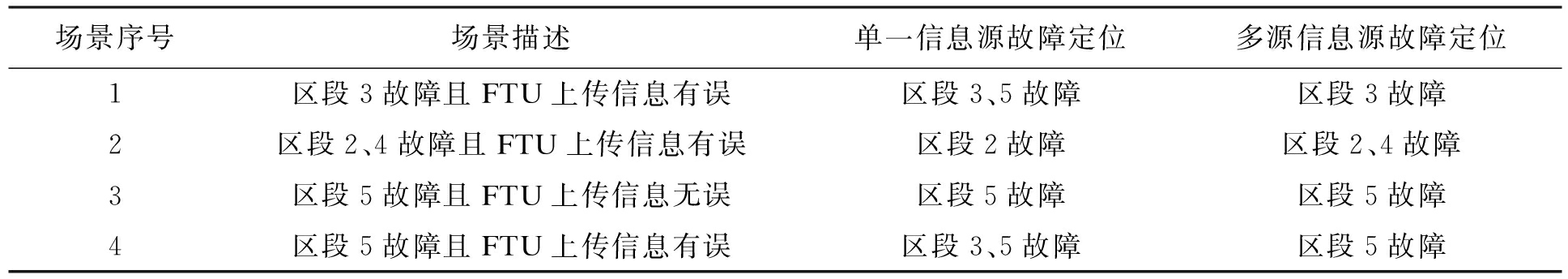 场景序号场景描述单一信息源故障定位多源信息源故障定位1区段3故障且FTU上传信息有误区段3、5故障区段3故障2区段2、4故障且FTU上传信息有误区段2故障区段2、4故障3区段5故障且FTU上传信息无误区段5故障区段5故障4区段5故障且FTU上传信息有误区段3、5故障区段5故障