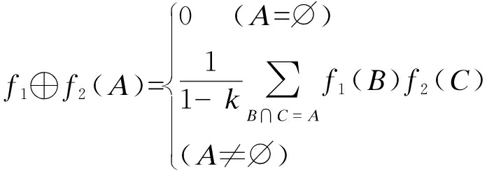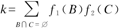 对于本文中来自两个信息源的证据,它们的概率分配函数分别为f1、f2,且相互独立,可将其进行融合,即