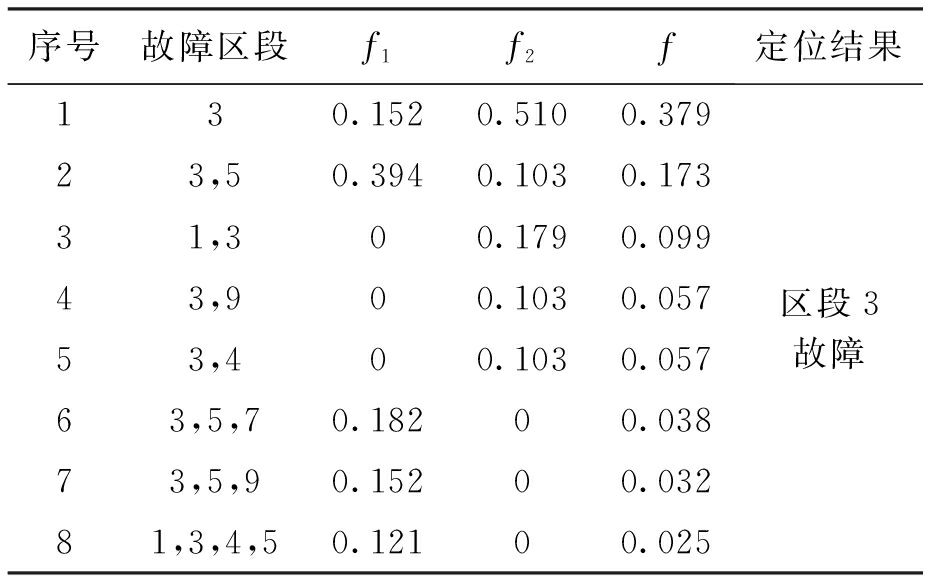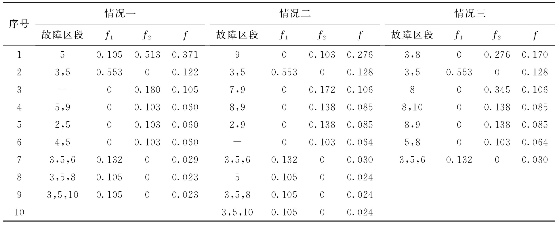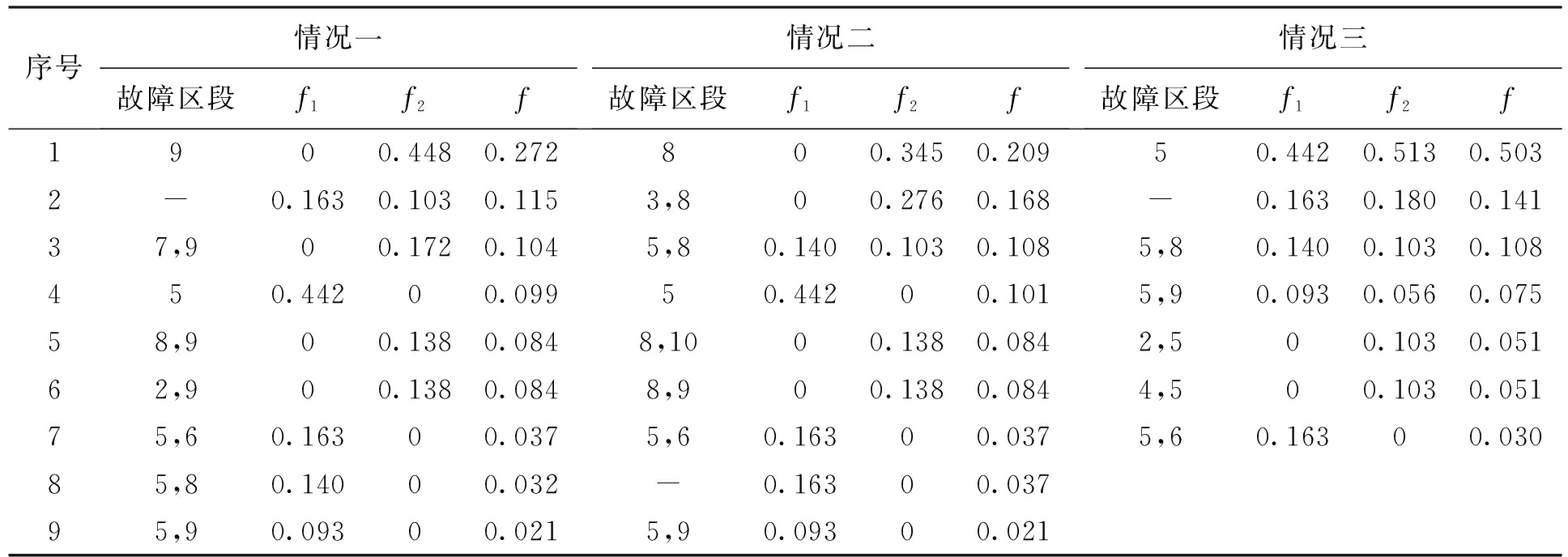序号故障区段f1f2f定位结果130.1520.5100.37923,50.3940.1030.17331,300.1790.09943,900.1030.05753,400.1030.05763,5,70.18200.03873,5,90.15200.03281,3,4,50.12100.025区段3故障