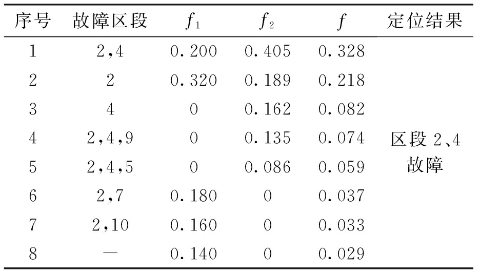 序号故障区段f1f2f定位结果12,40.2000.4050.328220.3200.1890.2183400.1620.08242,4,900.1350.07452,4,500.0860.05962,70.18000.03772,100.16000.0338-0.14000.029区段2、4故障
