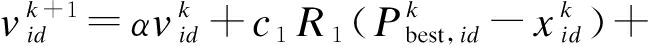 分别为粒子i第k+1代第d维的速度与位置;α为惯性因子;c1、c2为加速因子;