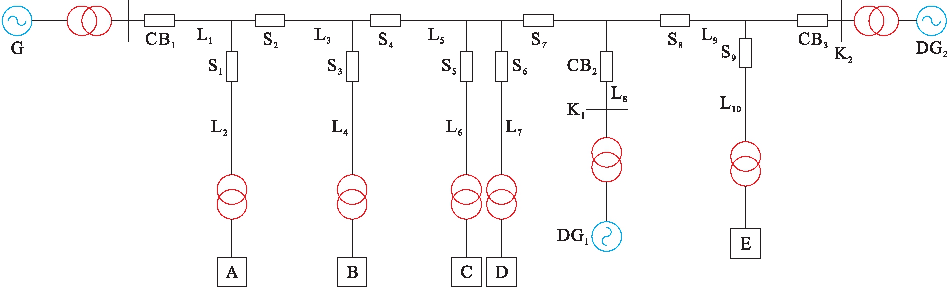 为了验证本文所提出的故障定位方法的有效性,采用图2所示的含分布式电源的配电网模型进行分析.图2中,G为系统电源,DG1、DG2为分布式电源;K1、K2为分布式电源接入开关;CB1~CB3为进线断路器;S1~S9为分段开关;L1~L10为线路区段编号;A~E为配电网内的用户.分段开关与断路器上均配置FTU,并且可采集用户A~E的用电信息.