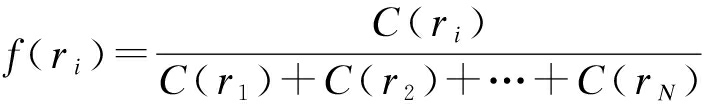 由于粒子群算法是一种群智能搜索算法,在每一次迭代中,粒子群由初始位置逐渐向最优解逼近.随着迭代次数的增加,粒子群中最优解所占比例将越来越大,因此,可以利用满足收敛条件后的粒子浓度表示概率分配函数.因为粒子群中存在适应度较差的解存在,所以无需考虑所有粒子,只需考虑浓度前N的粒子,概率分配函数f可表示为
