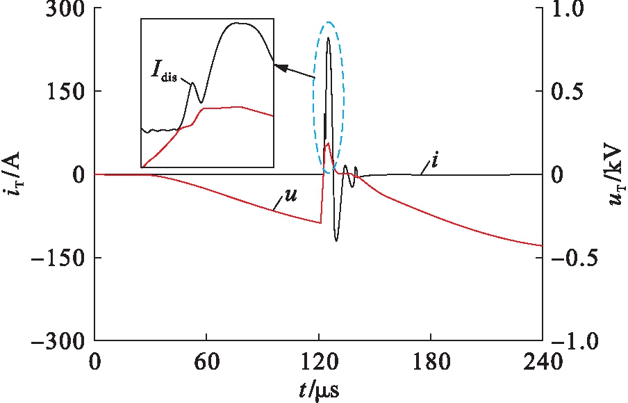 为更好地理解反向恢复期内晶闸管的动态特性,本文首先对二次导通过程进行分析.采用上述实验系统,使用5.6 kV/1 kA大功率晶闸管试品,设定通态电流幅值Ip=300 A,脉冲电压作用下反向恢复阶段波形如图2所示,红色为晶闸管阴阳极电压波形,黑色为电流波形,电压脉冲施加于t=120 μs,此时晶闸管电压与电流迅速升高,脉冲电压导致晶闸管流过容性位移电流Idis.在正向脉冲电压的作用下,晶闸管电流继续升高,此后,电压跌落接近于零,电流发生振荡,说明脉冲电压作用下晶闸管在反向恢复期内再次开通.