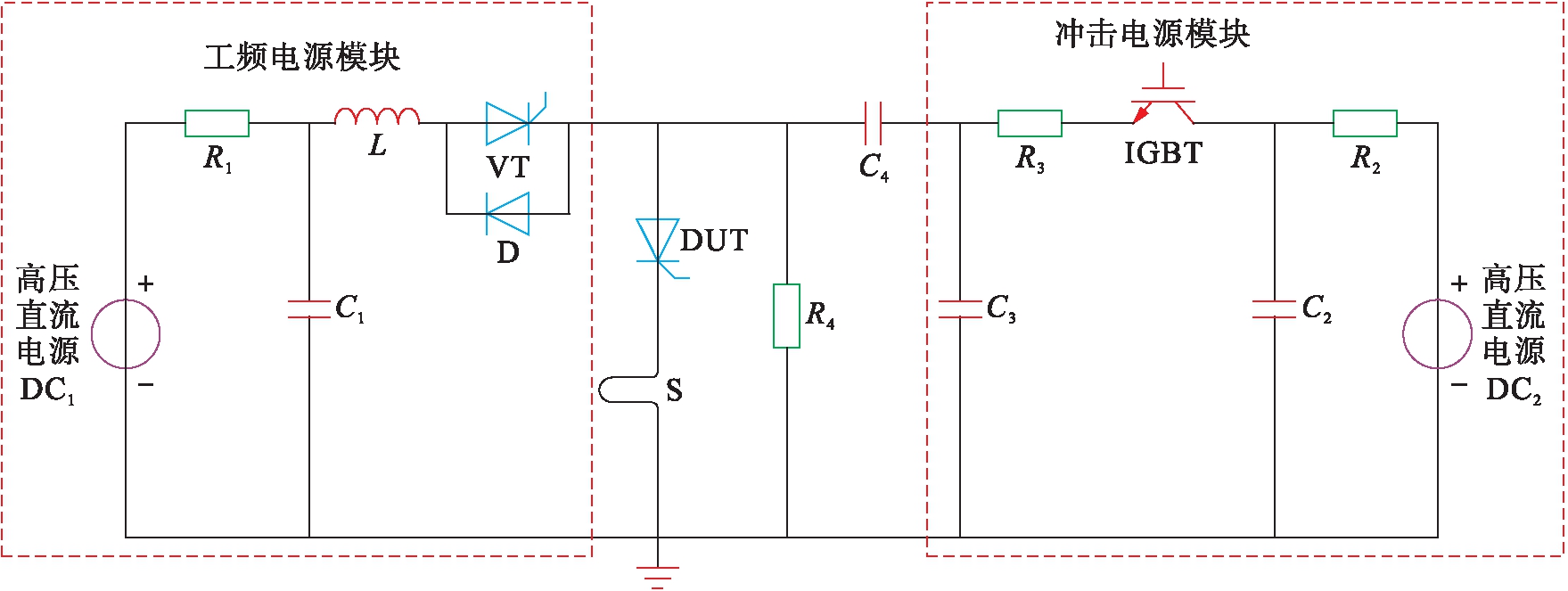 本文主要关注晶闸管反向恢复阶段在脉冲电压作用下动态特性,因此,实验系统涉及正向导通及反向恢复期脉冲电压两部分的叠加.由于大功率晶闸管电流扩散效应较为明显,为使晶闸管完全开通,需要较大的测试电流与较长的导通时间.本文选取正弦半波法产生正向导通电流,图1为反向恢复特性实验电路图,其中左半部分电路对应工频电源模块.高压直流电源DC1用于工频电源模块主电容C1充电,L与电容C1形成振荡回路,用于产生正向导通的工频半波电流,R1为充电电阻,D为续流二极管,VT为晶闸管开关,DUT为晶闸管试品,S为分流器.脉冲电压产生电路如图1中冲击电源模块所示,主要由R2C2充电回路、R3C3放电回路与全控开关IGBT组成,通过改变R3与C3的大小调节叠加电压脉冲.由C4与R4组成高通滤波电路,用于工频电源模块和冲击电源模块之间的隔离.IGBT驱动信号通过单片机进行延时控制,实现反向恢复过程中电压脉冲施加时刻的调节.
