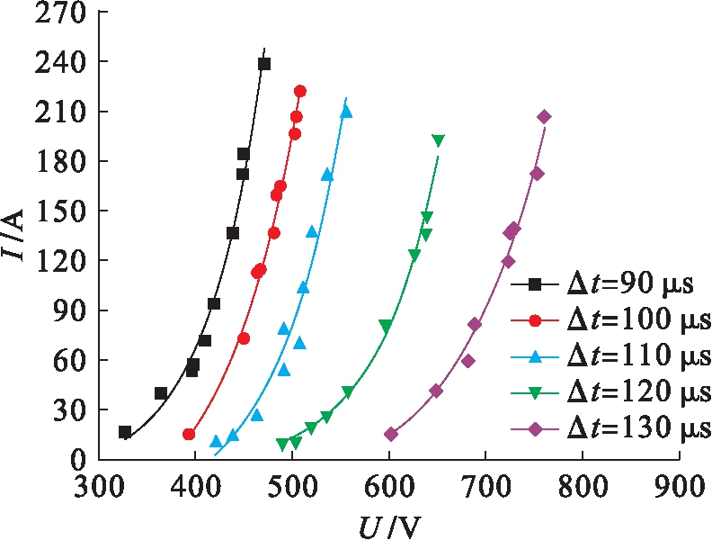 随着晶闸管反向恢复过程的进行,晶闸管阻断能力不断恢复,引起同样大小的导通电流需要更高的脉冲电压.因此,随着脉冲时延增加曲线的右移,同样电压引起的导通电流迅速降低.当Δt超过120 μs之后,晶闸管并未完全导通,故对应的dI/dU较小,曲线更为平缓.