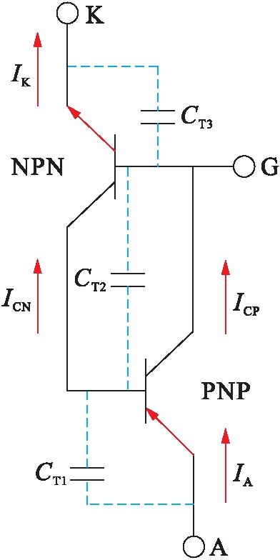 由于引起导通的电压脉冲频率较高,晶闸管内部结电容无法忽略,因此,采用晶闸管高频等效小信号模型对由位移电流Idis引起的二次导通过程进行分析.晶闸管可等效为PNP与NPN两个晶体管,结构示意图如图3所示,其中,CT1、CT2和CT3均为等效电容.