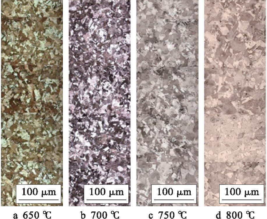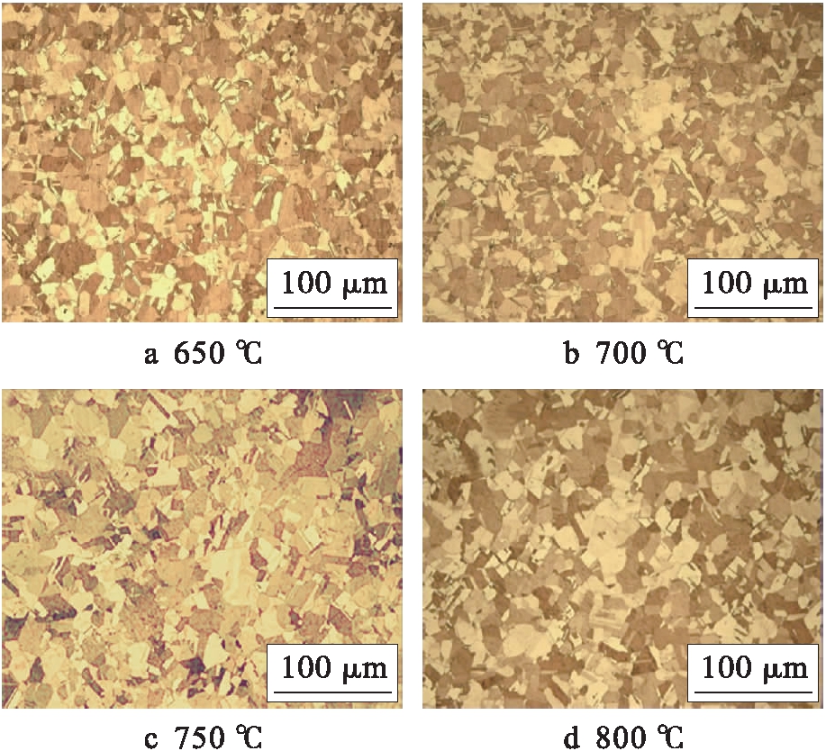 对不同挤压温度下获得的挤压棒心部进行微观组织分析,结果如图3所示.观察图3可以发现,不同挤压温度下挤压棒心部的组织形貌变化呈现以下规律:挤压棒心部的晶粒尺寸随挤压温度的升高而逐渐变大.这是因为随着挤压温度的不断升高,试样的再结晶晶粒受热继续长大,使得晶粒尺寸逐渐增大.另外,当挤压温度为650 ℃时,挤压棒心部的微观组织中出现了退火孪晶.当挤压温度继续升高至750 ℃时,挤压棒中出现了异常长大的晶粒,且退火孪晶占比升高.