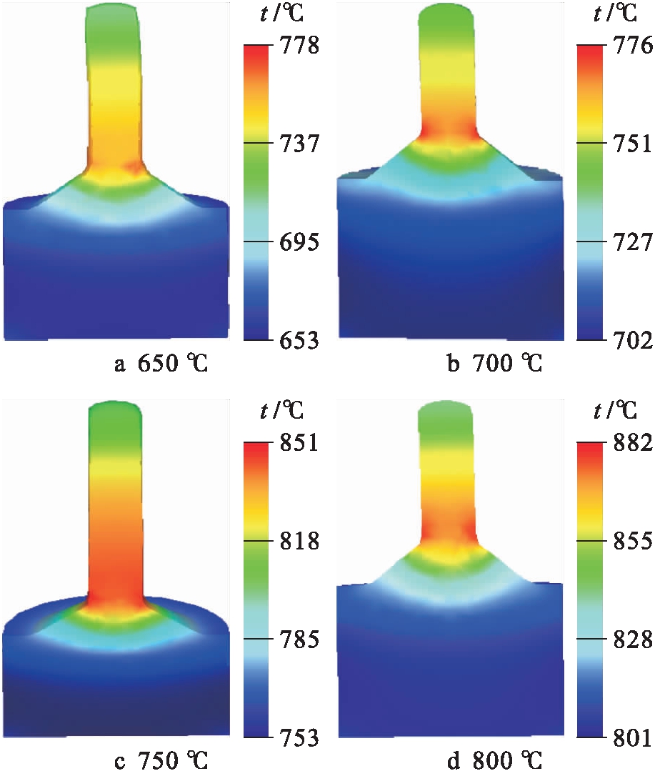 图2 不同挤压温度下挤压过程中的温度分布