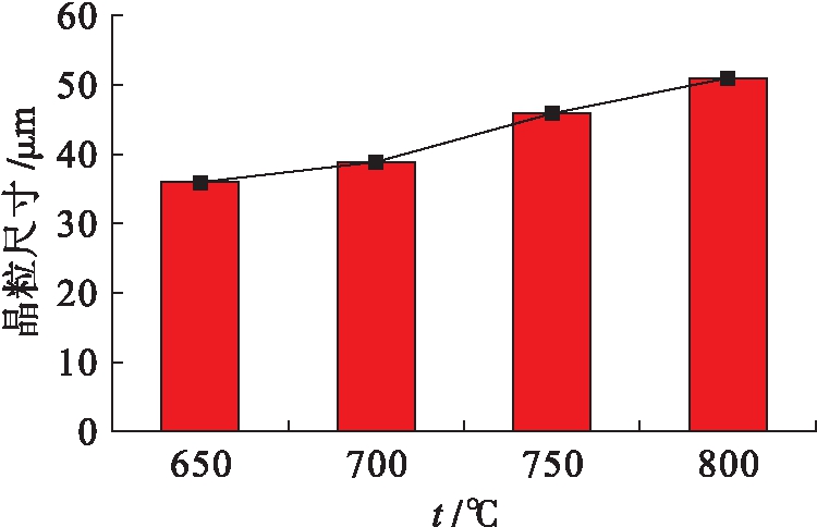 由图4可知,当挤压温度为650~700 ℃时,由于温度过高变形区内已发生再结晶的晶粒发生了长大现象,导致变形区内的晶粒变得粗大,使得试样的平均晶粒尺寸随挤压温度的升高而不断增大.由图4可见,当挤压温度为650 ℃时,挤压棒材的平均晶粒尺寸为36 μm.当挤压温度升高至800 ℃后,受挤压温度过高的影响,部分晶粒发生了异常长大,使得试样的平均晶粒尺寸继续增大,其数值达到了51 μm.