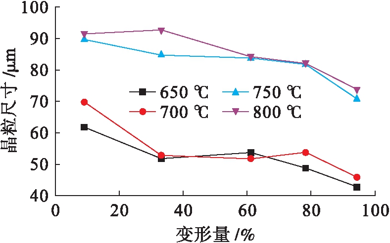 对图10中的数据进行具体分析后发现,当挤压温度处于650~700 ℃时,压余变形区的平均晶粒尺寸趋向于由60 μm变为45 μm;在更高的挤压温度(750~800 ℃)下,平均晶粒尺寸趋向于由90 μm变为75 μm.结合以上分析可知,在650~800 ℃的挤压温度跨度下,挤压压余变形区的晶粒尺寸随着挤压过程的进行而不断细化.