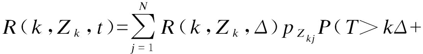 在t>Δ条件下,变压器系统由状态Zk运行t时间,根据贝叶斯公式可得仍未发生故障的概率为P(T>(k+1)ΔT>kΔ,Zk)=R(k,Zk,Δ),在(k+1)Δ时刻前状态由Zk转变为Zk+1,在Zk+1状态下变压器继续工作时长为t-Δ,即在(k+1)Δ时刻后的工作时长,概率为P(T>kΔ+tT>(k+1)Δ).可以得出在状态Zk下,运行t时间的可靠度函数为