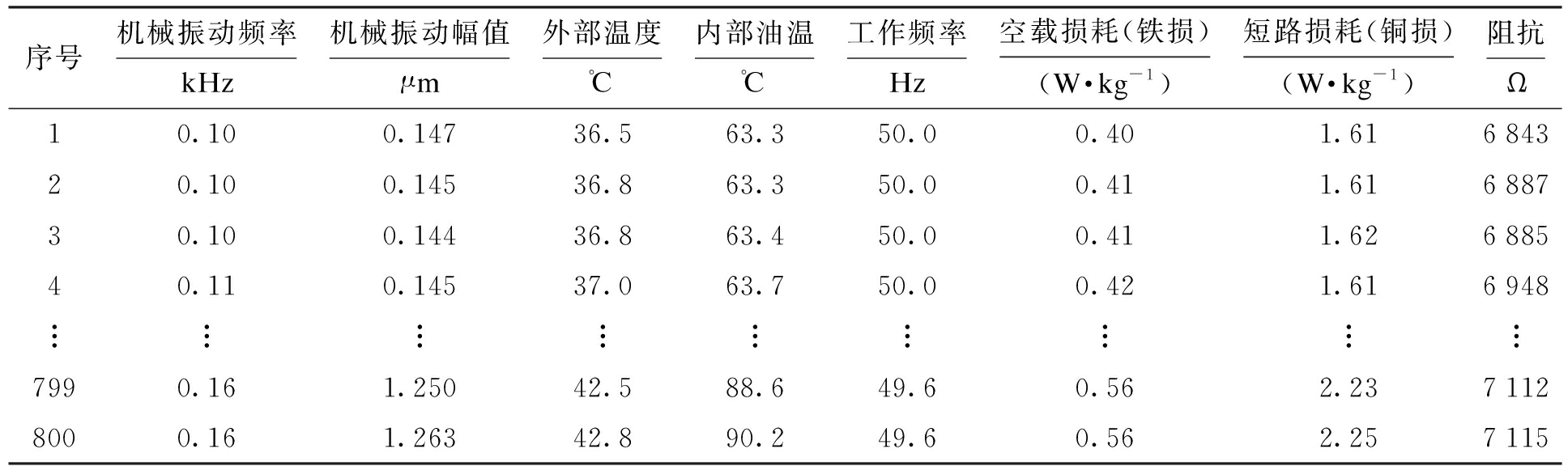 序号机械振动频率kHz机械振动幅值μm外部温度℃内部油温℃工作频率Hz空载损耗(铁损)(W·kg-1)短路损耗(铜损)(W·kg-1)阻抗Ω10.100.14736.563.350.00.401.61684320.100.14536.863.350.00.411.61688730.100.14436.863.450.00.411.62688540.110.14537.063.750.00.421.616948︙︙︙︙︙︙︙︙︙7990.161.25042.588.649.60.562.2371128000.161.26342.890.249.60.562.257115
