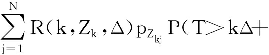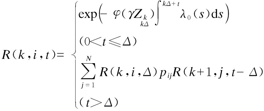 式中,P(T>kΔ+tT>(k+1)Δ,Zk+1=j)为在k+1监测点状态为j时工作到时间kΔ+t的概率,根据可靠度函数可表示为R(k+1,j,t-Δ).代入式(6),并将式(3)整理得到在完全信息条件下变压器系统运行可靠度函数为