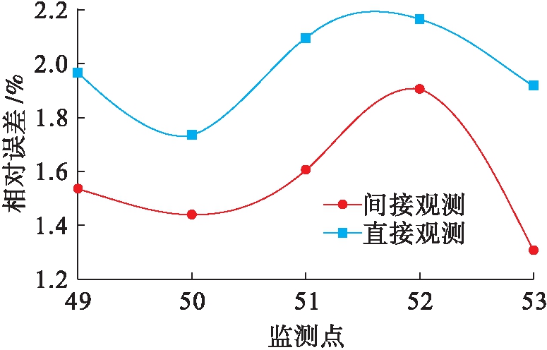 真实情况下,变压器系统所采集数据类型为部分不可观测,由式(9)~(11)计算剩余寿命,预测剩余寿命数据与完全信息条件下剩余寿命对比如图3所示,两种条件下剩余寿命预测相对误差对比如图4所示.设在监测点k=49,50,51,52,53处,观测值分别取值1,1,2,3,3,将预测寿命部分信息条件下变压器预测寿命放入表3进行对比.
