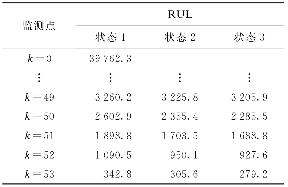假设以上为状态模型完全信息状态下,在Δ=750时,不同监测点k=1,2,…,53由式(8)得到剩余寿命,结果如表2所示.在k=0时,变压器处于全新状态,状态2、3不存在,状态1时该变压器剩余寿命为39 750.3 h.