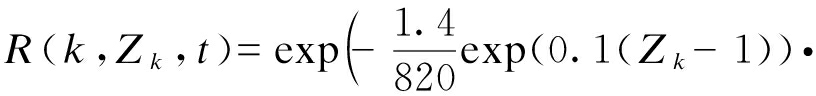 式中:条件可靠度函数R()表示已知变压器系统在Δ,2Δ,…,kΔ时刻的状态分别为Z1,Z2,…,Zk,在kΔ时刻没有发生故障,继续工作到kΔ+t时刻的概率;T为变压器发生故障的运行时间.假设运行时系统退化参数维持定值,在下一监测点之前状态转移矩阵发生变化,即状态变化时间不超过Δ.