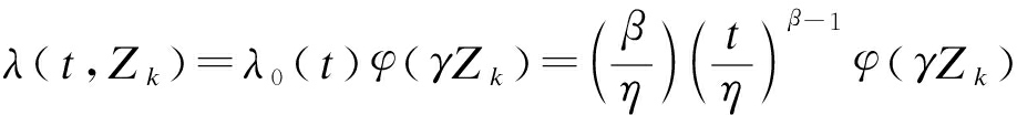 式中:λ(t,Zk)为故障率;Zk为协变量,即系统运行监测值协方差;λ0(t)为与时间相关的故障率;δ为回归参数,表示协变量对故障函数的影响系数.假设各参数的数值不随时间变化而变化.