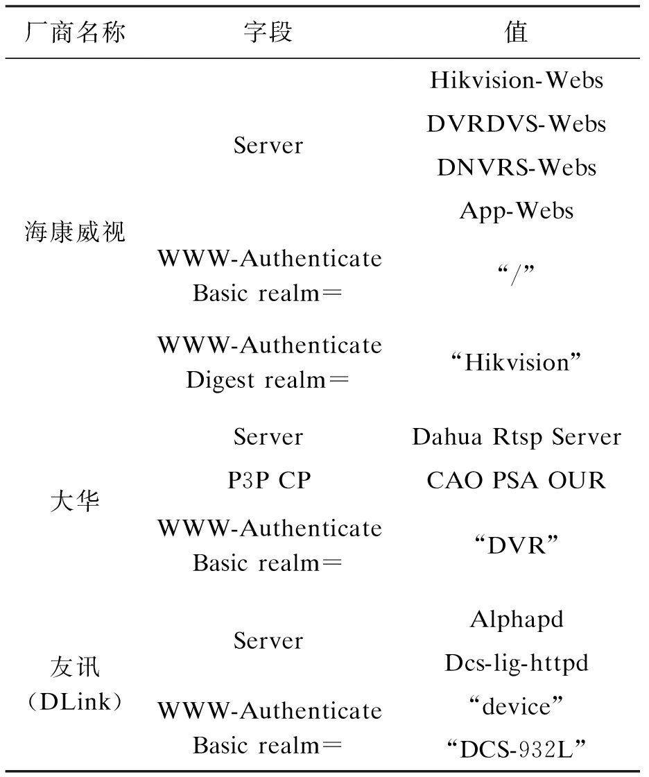 厂商名称字段值海康威视大华友讯(DLink)ServerWWW-AuthenticateBasic realm=WWW-AuthenticateDigest realm=ServerP3P CPWWW-AuthenticateBasic realm=ServerWWW-AuthenticateBasic realm=Hikvision-WebsDVRDVS-WebsDNVRS-WebsApp-Webs“/”“Hikvision”Dahua Rtsp ServerCAO PSA OUR“DVR”AlphapdDcs-lig-httpd“device”“DCS-932L”