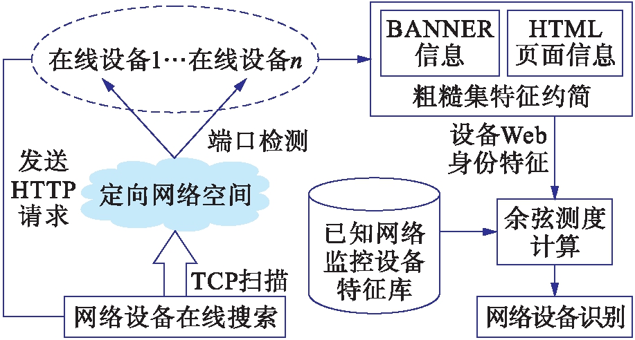 庞大的视频监控网络在发挥社会安全保障的同时,也暴露出很多问题,最明显的问题就是重建设轻管理.由于缺乏有效的管理手段,大量的网络视频监控设备存在监控区域交叉冗余的现象[1].许多处于僵尸状态的监控设备在监控能力不断弱化的同时,却仍然持续不断地占用着电力、传输带宽等资源.网络视频监控系统的建设与维护之间脱节现象明显,大量监控设备出现故障后难以实时地检测与维护,导致关键区域、关键时间及关键事件视频监控信息的缺失,为公共安全类事件的侦查与司法取证都造成了难以估量的影响.网络视频监控设备的在线搜索与识别已经引起国内外学者的普遍关注,逐渐形成了一个新的研究方向.文献[2]中介绍了Nmap等主流网络设备扫描软件和工具,这些软件和工具通过发送特定组合的数据包获取网络设备的标识信息,经常被用在服务端口扫描、操作系统、应用服务与版本信息检测等任务中.文献[3]通过扫描全网IP地址的方法检测网络中的服务器.在网络设备识别研究领域,文献[4]在识别网络服务器时,将响应报文的头部域顺序和状态码作为身份特征进行识别.由于在身份特征中引入了更加稳定的结构特征、静态文件及Cookie,识别结果鲁棒性更强,可有效避免BANNER欺骗和构造大量HTTP请求所带来的影响.文献[5]提出了一种基于统计数据与贝叶斯方法的设备识别模型,并研究了通过计算设备身份特征的可信度来识别网络设备的方法.文献[6]给出了一种用于搜索互联网上各类终端设备的统一理论框架.