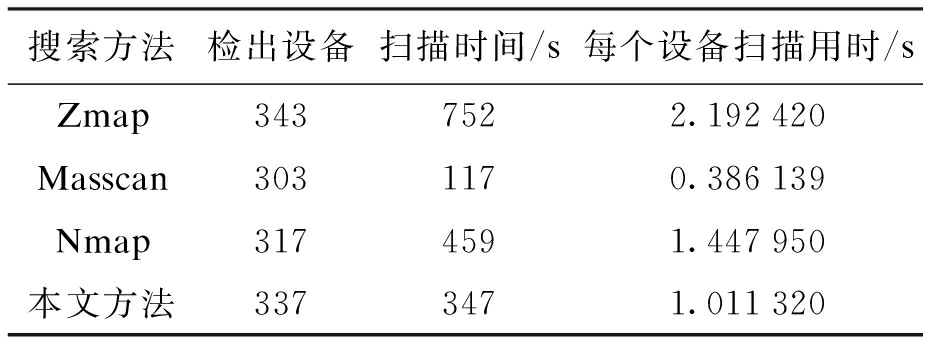 搜索方法检出设备扫描时间/s每个设备扫描用时/sZmap3437522.192420Masscan3031170.386139Nmap3174591.447950本文方法3373471.011320