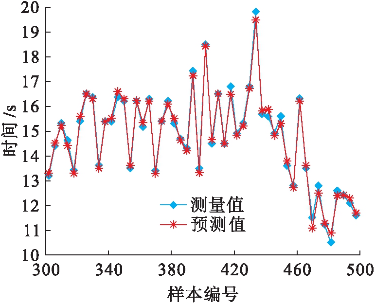 在体育成绩的预测上,采用20 s内的64 029个百米跑的成绩完成模型训练.针对21 198个样本,将其中的60%样本作为训练集,20%作为验证集,剩下的20%作为测试集.通过图1定义的CNNs完成对训练集的训练,并通过测试集完成对已经训练好的体育成绩预测模型的测试.为了可视化测试结果,图2给出了测试难度最大的500个样本.