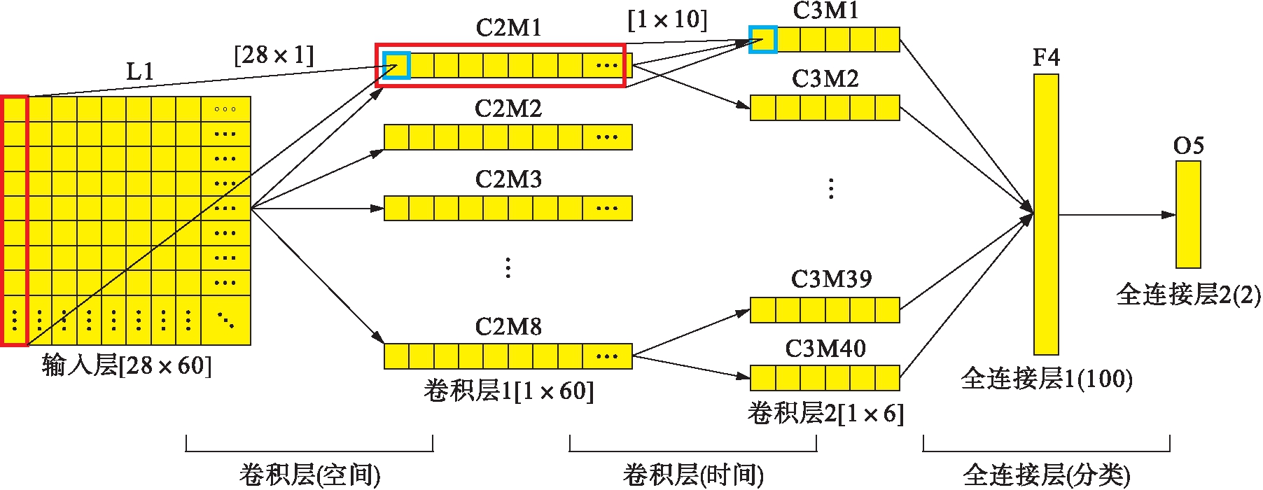 第二层(C2):第一个卷积层的作用是实现纵向的空间滤波用于提取体育特征的灰度空间特征.空域特征的卷积核大小为[28×1],卷积输出的特征图大小为[1×60],卷积核采用向量卷积方式.