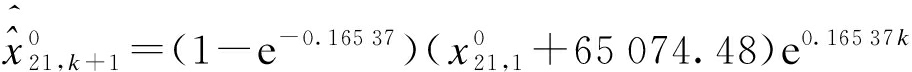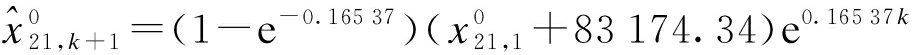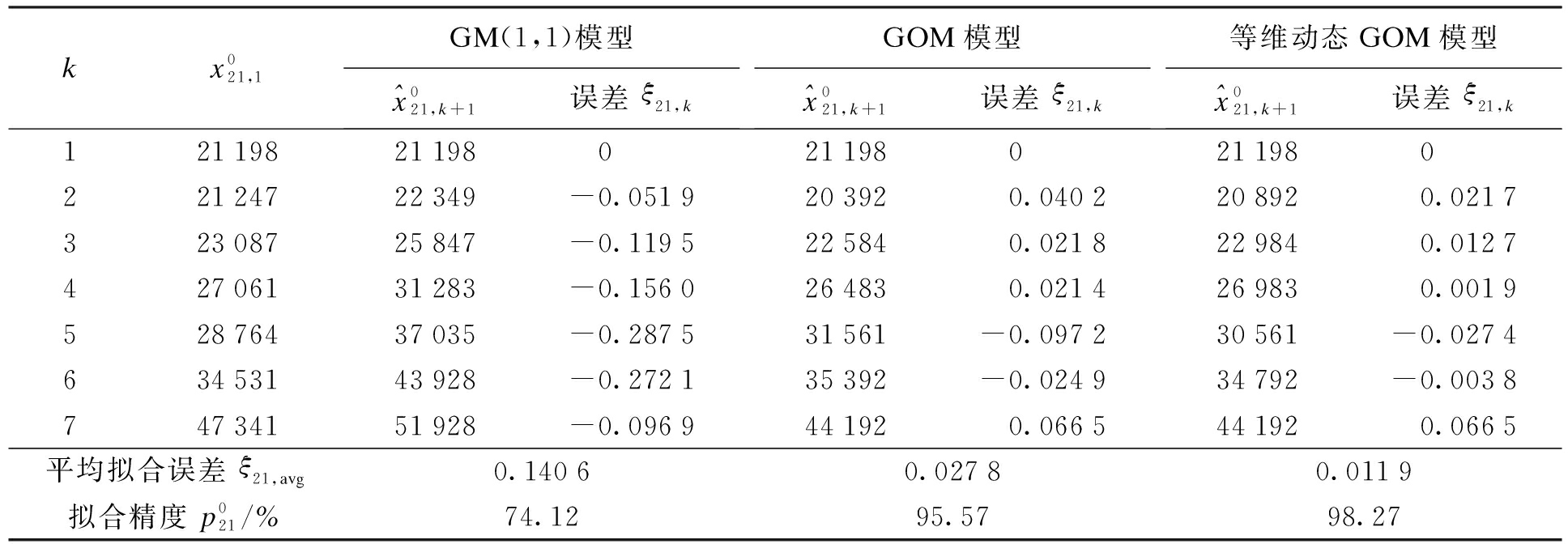 kx021,1GM(1,1)模型^x021,k+1误差ξ21,kGOM模型^x021,k+1误差ξ21,k等维动态GOM模型^x021,k+1误差ξ21,k12119821198 021198 021198 022124722349-0.051920392 0.040220892 0.021732308725847-0.119522584 0.021822984 0.012742706131283-0.156026483 0.021426983 0.001952876437035-0.287531561-0.097230561-0.027463453143928-0.272135392-0.024934792-0.003874734151928-0.096944192 0.066544192 0.0665平均拟合误差ξ21,avg0.14060.02780.0119拟合精度p021/%74.1295.5798.27