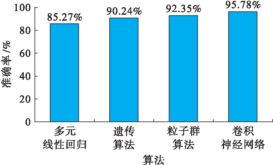 为了横向比较本文提出的CNNs性能,采用相同数量的训练集、验证集和测试集,分别比较本文算法与当前主流算法.图3为百米跑体育成绩预测平均精度对比结果.从图3中的对比结果可以看出:1)多元线性回归对于百米跑体育成绩预测精度最低,该模型不能反映普通大众的体育成绩变化特点,构建出的预测模型误差较大,在大群体数据的预测中几乎没有应用价值.2)遗传算法和粒子群算法等群智能算法结果优于多元线性回归,但是此类算法更适合小样本的数据分析,对于海量样本的体育成绩预测结果不理想.虽然获得了较为不错的平均预测精度,但是在极个别特殊情况下的体育成绩预测效果一般.3)本文提出的CNNs属于深度学习模型,该模型在海量数据样本中的识别能力较强,综合图2、3中的结果可以看出,深度CNNs拥有海量的权重和阈值完成对特殊情况的预测,因此,不论是整体预测的平均精度还是特殊极端结果的预测都获得了良好的效果,更适合体育成绩时间序列数据的预测.