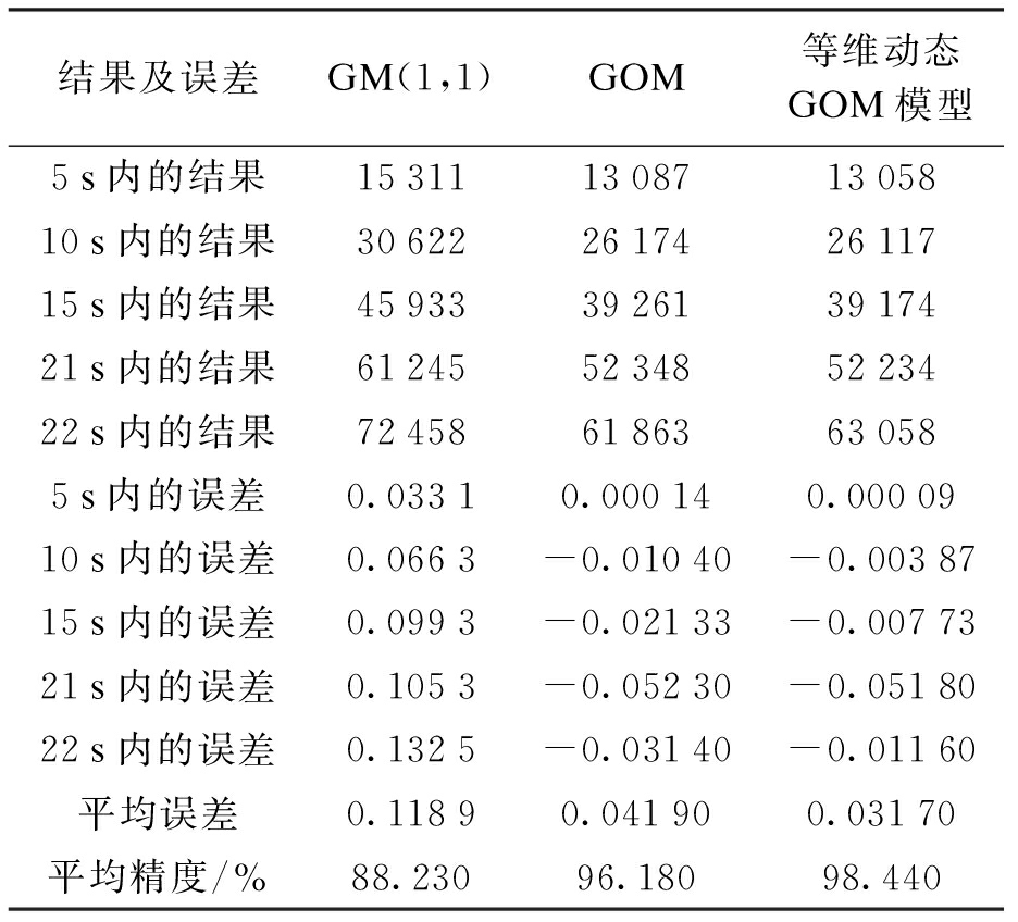 结果及误差GM(1,1)GOM等维动态GOM模型5s内的结果15311130871305810s内的结果30622261742611715s内的结果45933392613917421s内的结果61245523485223422s内的结果7245861863630585s内的误差0.03310.000140.0000910s内的误差0.0663-0.01040-0.0038715s内的误差0.0993-0.02133-0.0077321s内的误差0.1053-0.05230-0.0518022s内的误差0.1325-0.03140-0.01160平均误差0.11890.041900.03170平均精度/%88.23096.18098.440