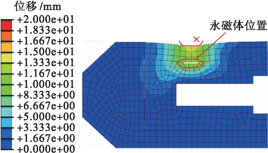 因一般硬质聚酯型聚氨酯密度在20~160 kg/m3之间,由此得到不同密度下的抗压弹性模量,并以此作为聚氨酯材料的属性进行模拟.假设外层聚氨酯泡沫密度ρ1为80 kg/m3,内层聚氨酯泡沫密度ρ2为40 kg/m3;模拟管道残余物厚度15 mm,位于传感器单元正上方,管道内径为262 mm,内层与外层聚氨酯厚度相同,均为45 mm.通过ABAQUS数值模拟检测器的型体变化情况如图2所示,此时外层聚氨酯与内层聚氨酯结合处(永磁体放置的位置)位移为10.461 6 mm.
