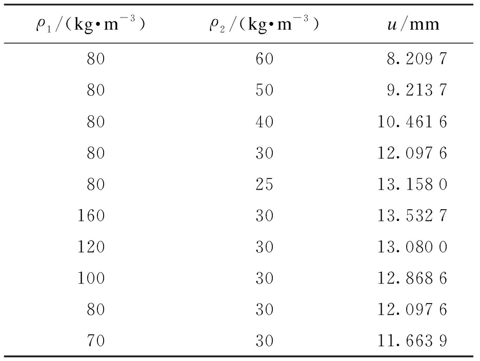 ρ1/(kg·m-3)ρ2/(kg·m-3)u/mm80608.209780509.2137804010.4616803012.0976802513.15801603013.53271203013.08001003012.8686803012.0976703011.6639