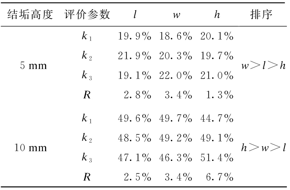 结垢高度评价参数lwh排序5mm10mmk119.9%18.6%20.1%k221.9%20.3%19.7%k319.1%22.0%21.0%R2.8%3.4%1.3%k149.6%49.7%44.7%k248.5%49.2%49.1%k347.1%46.3%51.4%R2.5%3.4%6.7%w>l>hh>w>l