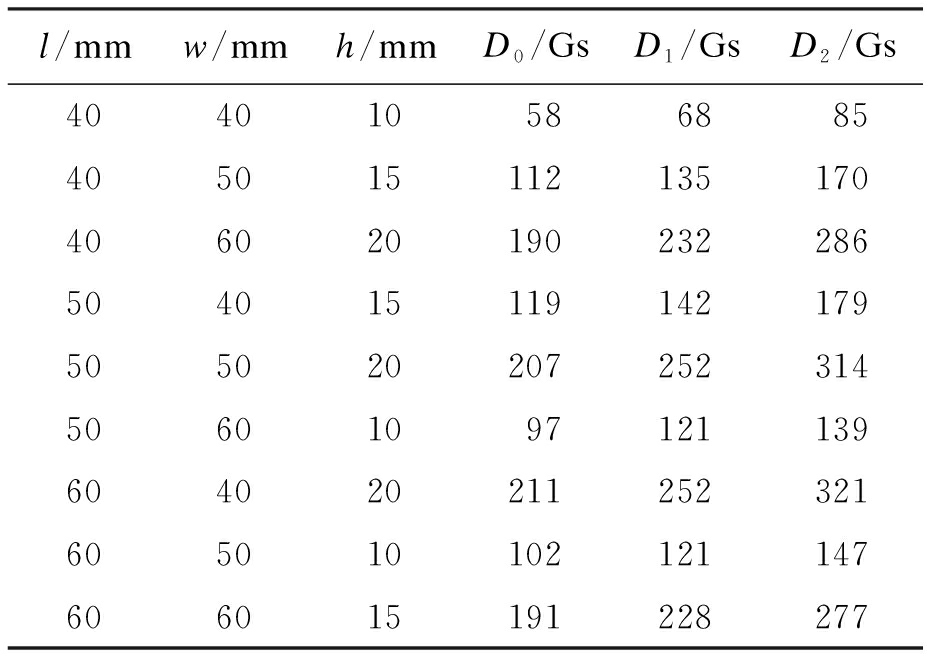 永磁体的材料属性选定后,磁体体积对磁场强度有着较大的影响.仿真磁体选择N40材料,剩磁约为1.26 T[8].如果磁体的体积过大,将会增加检测器的质量,体积过小将会影响磁体磁场强度,所以本文选取永磁体长l(检测器轴向)、宽w(检测器周向)和高h(检测器径向)3个影响因素,利用正交试验L9(34)设计正交试验仿真表.根据上述情况,设定永磁体的长度为40~60 mm,宽度为40~60 mm,厚度为10~20 mm.针对三个影响因素各取等分,其正交表如表3所示.分别根据这9种情况建模计算,计算后可得到3个优化对象的具体值如表3所示(表3中,D为选取不同结垢高度后得到的磁感应强度,D0、D1、D2分别代表0、5及10 mm结垢的磁感应强度).