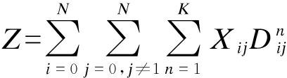 为节点i到节点j的运输距离;N为节点数量;K为配送车辆数.
