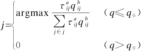 式中:τij为蚂蚁k在路径(i,j)上所释放的信息素含量;a为蚂蚁信息素启发因子,表示轨迹相对重要程度的参数;b为节点(i,j)间的转移期望启发因子,表示能见度的相对重要度的参数.每只蚂蚁附带清空表,每到达一个节点则清空客户集中该节点数据,当客户集为空时,则蚂蚁已访问过所有节点[10-11],判断是否违反了车辆的容量限制,如果违反了则返回到仓库,并且开始规划新路线,如果没有则进行下一步骤.