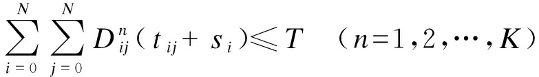 式中:tij为从节点i到节点j的运输时间;si为节点i的服务时间;T为车辆返回时间限制.