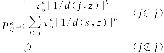 传统蚁群算法多采用当前节点i和下一节点j之间欧几里得距离的倒数作为启发函数因子,这种启发函数因子只是考虑了此刻节点与下一节点,而忽略了节点与目标节点之间的关系,因此会造成盲目路径搜索,致使搜索效率低和时间长等问题[9].在本文中,对启发式函数因子进行改进.将距离启发函数因子更改为下一个节点j和目标节点z之间的欧几里德距离的倒数.改进后蚂蚁路径搜索的过程中各节点距离目标节点越近,二者期望值越小,当当前节点可选择的下一节点与目标节点距离更近时,则期望值越大,其被选中的概率越大.这将有利于改进蚂蚁盲目搜索这一缺点,增强算法全局搜索能力和算法收敛速度.