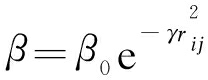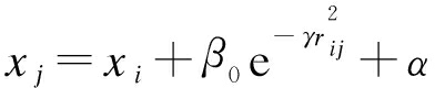 式中:β为萤火虫之间的吸引度,吸引度与观察萤火虫所看到的光线成比例;β0为在r=0处的吸引度,r为萤火虫与光源的距离;rij为两个萤火虫之间的距离;γ为光吸收系数.萤火虫i向萤火虫j的运动xi可表示为