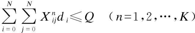 式中:di为第i个节点的货物需求;Q为车辆的最大容量限制,为一个常数.