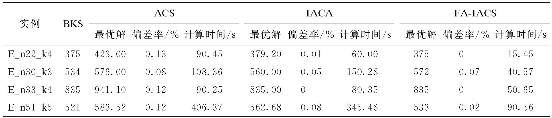 实例BKSACS最优解偏差率/%计算时间/sIACA最优解偏差率/%计算时间/sFA-IACS最优解偏差率/%计算时间/sE_n22_k4375423.000.1390.45379.200.0160.00375015.45E_n30_k3534576.000.08108.36560.000.05150.285720.0740.57E_n33_k4835941.100.1290.25835.00080.35835050.65E_n51_k5521583.520.12406.37562.680.08345.465330.0290.56