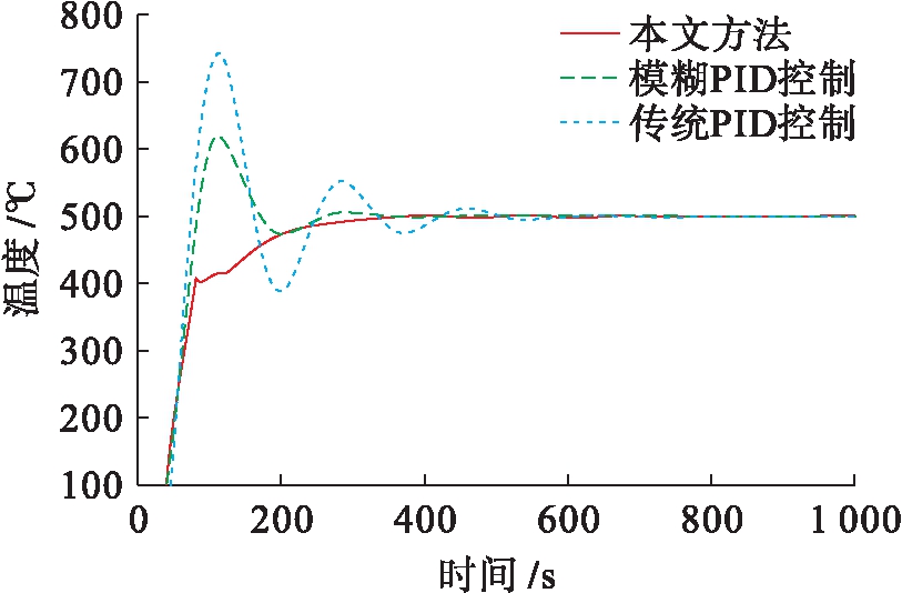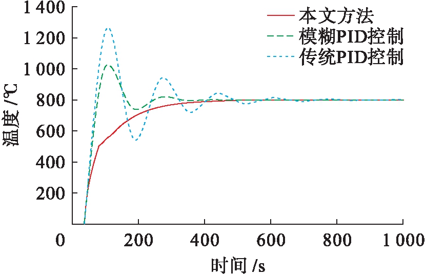在100 ℃的初始温度条件下,设定控制的目标温度值分别为500和800 ℃,得到了传统PID控制算法、文献[1]的模糊PID控制算法和本文方法的温度控制实验结果曲线分别如图3、4所示.根据图中所示的曲线,本文提出的基于神经网络的PID控制+模糊Smith预估补偿的自适应方法能够将温度控制到期望值.在目标温度为500 ℃的实验中,本文方法得到的调节时间约为390 s,控制精度约为±0.5 ℃,超调量接近于0,而模糊PID控制算法和传统PID控制算法得到的收敛时间、控制精度和超调量分别为410 s、±0.8 ℃、20%,570 s、±1.5 ℃、45%;在目标温度为800 ℃的实验中,本文方法得到的收敛时间约为440 s,控制精度约为±0.6 ℃,超调量趋近于0,而模糊PID控制算法和传统PID控制算法得到的收敛时间、控制精度和超调量分别为450 s、±1 ℃、25%,650 s、±1.8 ℃、48%.