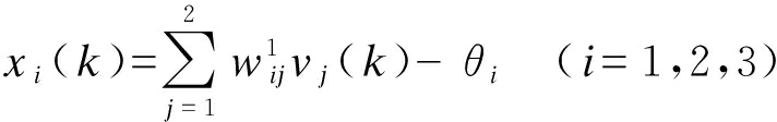作为系统自适应控制的核心,单神经元网络是一个多输入单输出的非线性单元,系统采用2×3×1的形式.首先,在前向传播阶段,使用系统的温度设定值和系统的输出反馈值作为神经网络的输入,以控制量作为神经网络的输出.在输入层,取设定值s(k)和实际值y(k)作为神经元的状态函数v,即
