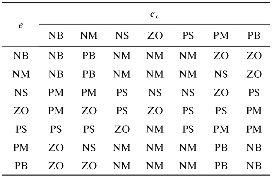 根据模糊控制原理,考虑温度偏差e和温度偏差的变化量ec作为其输入变量,将其各分为7档{NB,NM,NS,ZO,PS,PM,PB},模糊Smith预估补偿控制需要建立模糊规则和选择模糊机理.在设计规则时需要考虑:如果温度偏差较大,模糊输出应该使得实际温度接近设定温度,防止超调过大;如果温度偏差较小,模糊输出应该使得温度恒定.具体的模糊补偿控制规则如表1所示.