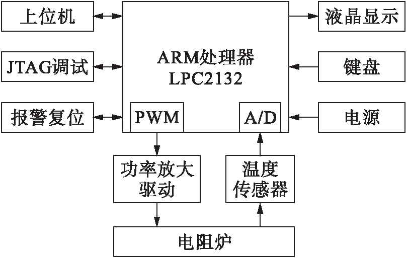 本文设计的电阻炉温度控制系统总体设计框图如图1所示,主要包含了实时温度数据的A/D采集和液晶显示、制冷和加热装置以及驱动、上位机通讯模块、JTAG调试接口、报警和复位设备、ARM处理器等部分.