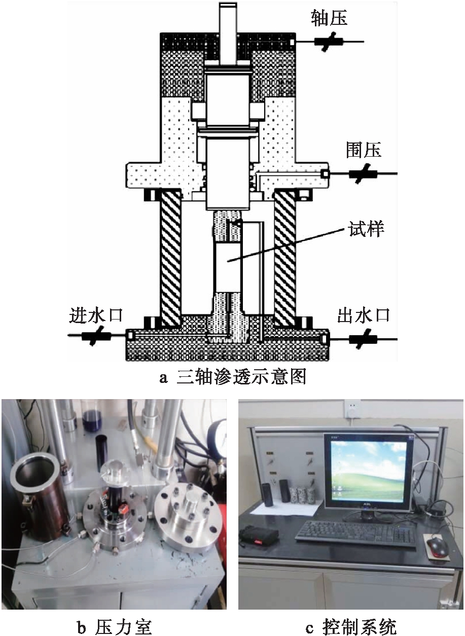 根据《水泥土配合比设计规程》(JGJT 233-2011)以及本试验的设想,进行水泥土试件三轴压缩渗透试验.本次试验采用温度、渗流、应力及化学耦合三轴压缩试验系统(T-H-M-C),如图2所示.