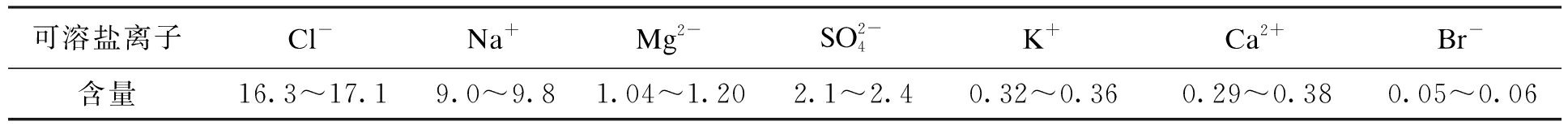 可溶盐离子Cl-Na+Mg2-SO2-4K+Ca2+Br-含量16.3~17.19.0~9.81.04~1.202.1~2.40.32~0.360.29~0.380.05~0.06