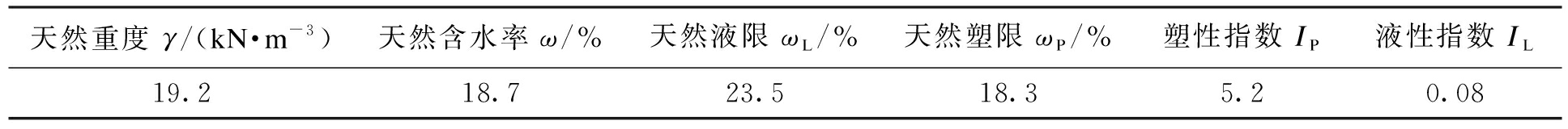 天然重度γ/(kN·m-3)天然含水率ω/%天然液限ωL/%天然塑限ωP/%塑性指数IP液性指数IL19.218.723.518.35.20.08